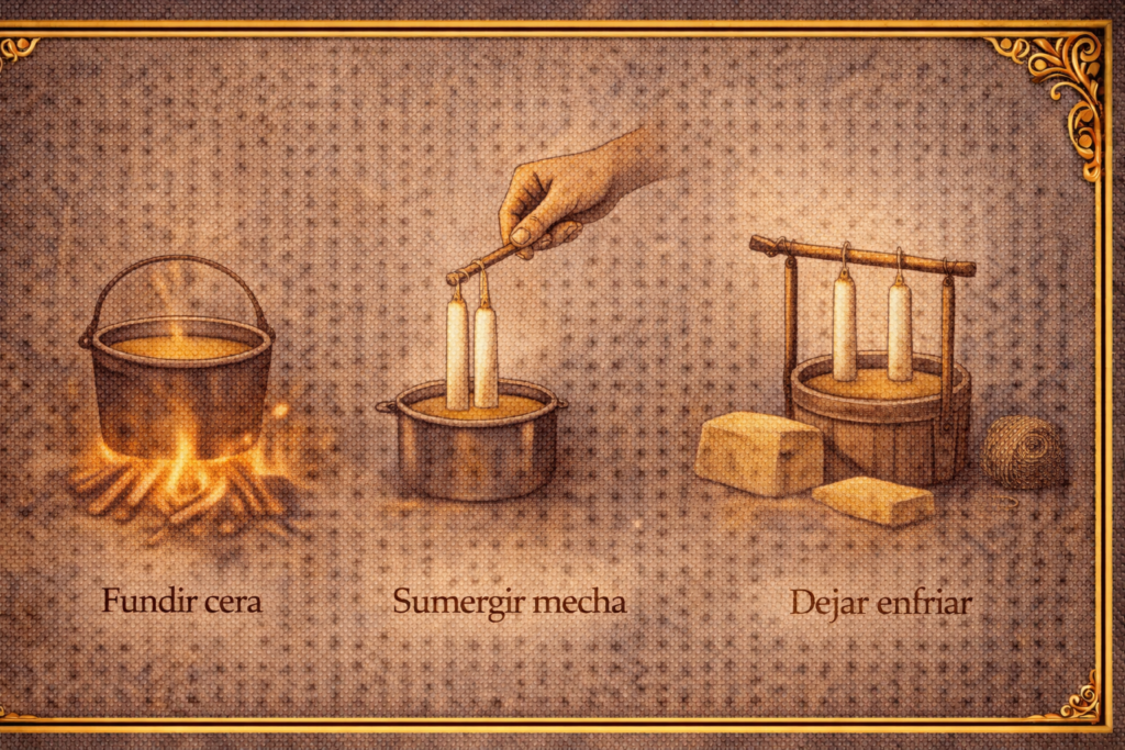 Las velas se han elaborado históricamente con materiales naturales y accesibles, adaptados a cada territorio. Las técnicas básicas han cambiado poco con el tiempo.