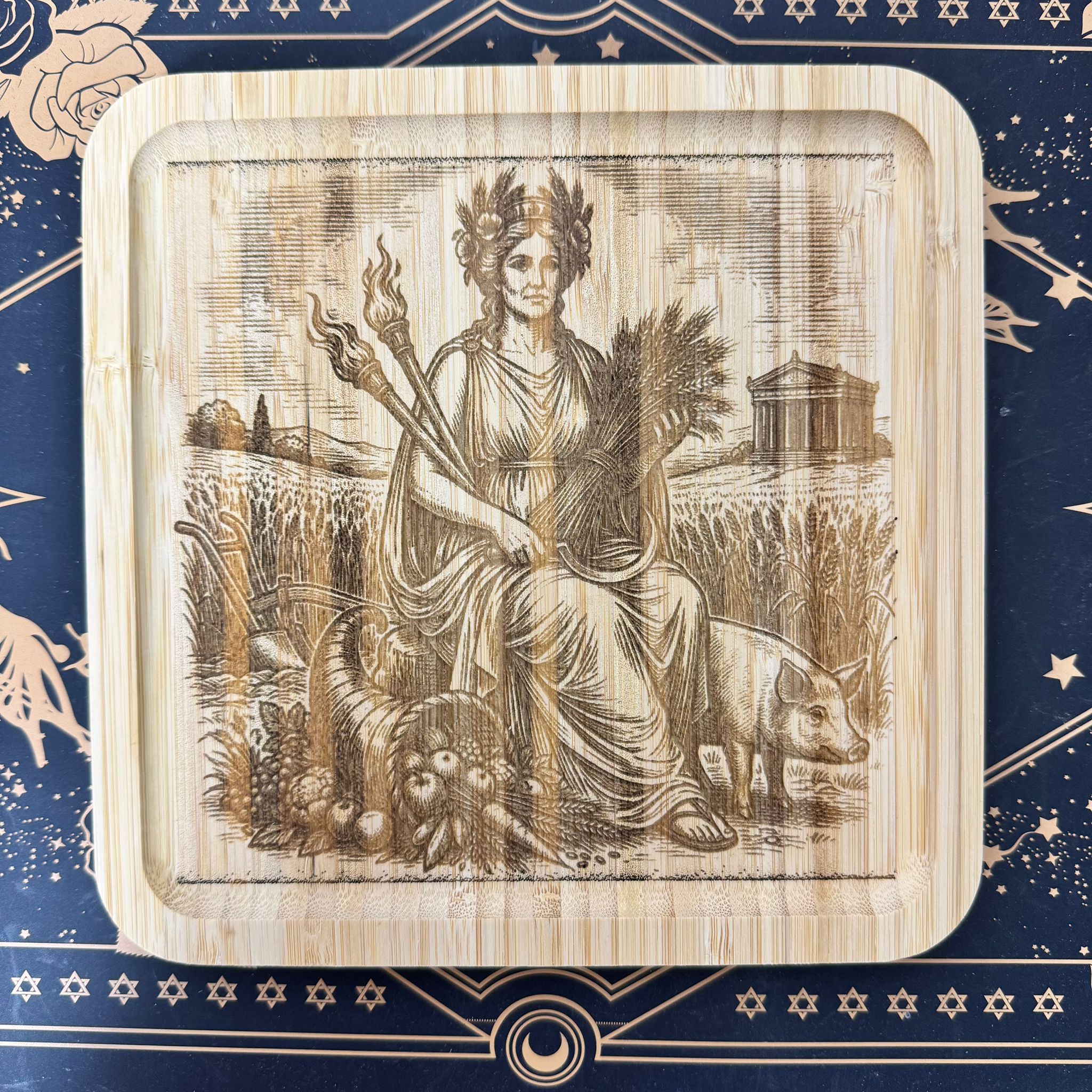 Fabricado en bambú natural, material vivo y renovable, este altar conecta directamente con la energía de la naturaleza en crecimiento constante. El grabado muestra a la diosa en su aspecto clásico, rodeada de símbolos de cosecha, grano y abundancia, convirtiéndolo en un punto de anclaje perfecto para rituales de prosperidad, gratitud y conexión con la Madre Tierra.