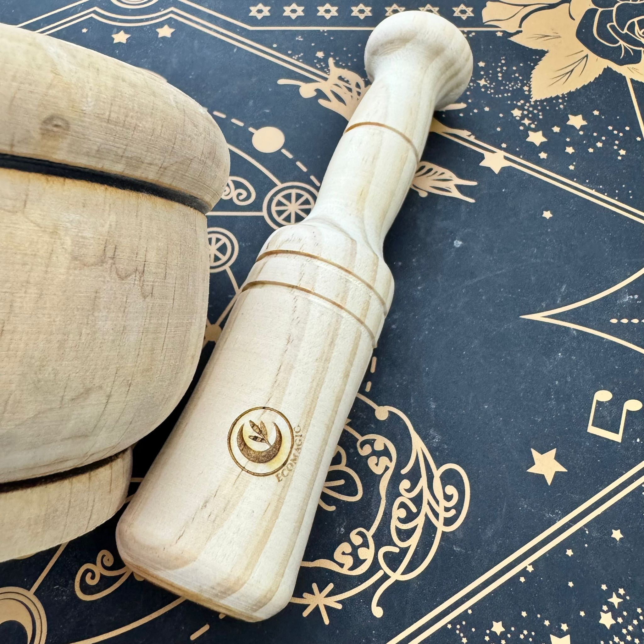 La madera, viva y cálida, aporta estabilidad y arraigo, mientras que el acto de machacar simboliza la transformación consciente: convertir lo simple en sagrado. Es una herramienta perfecta para rituales matutinos, preparaciones energéticas antes de comenzar el día o trabajos mágicos suaves pero constantes.