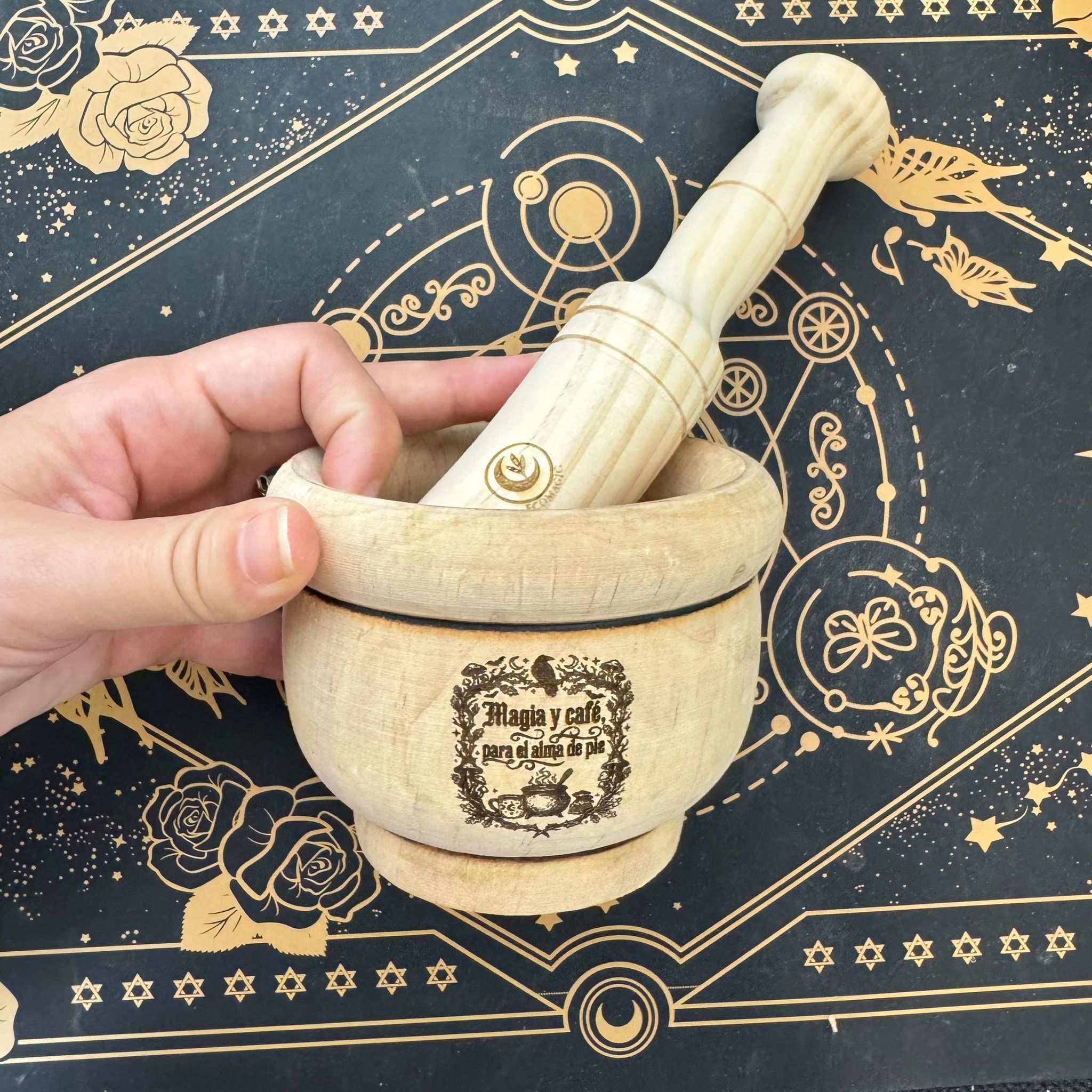 Mortero de madera – Modelo “Magia y café para el alma de pie”