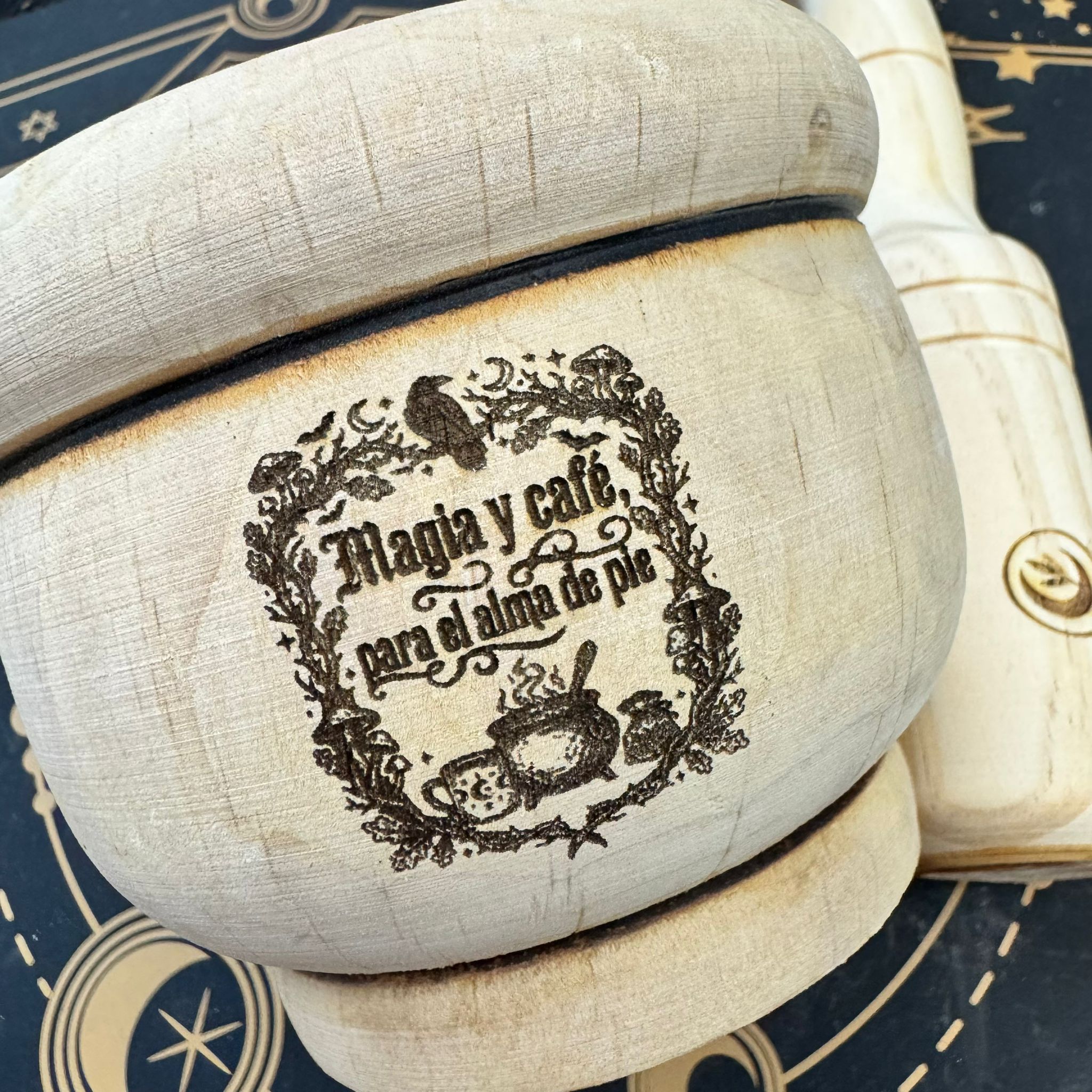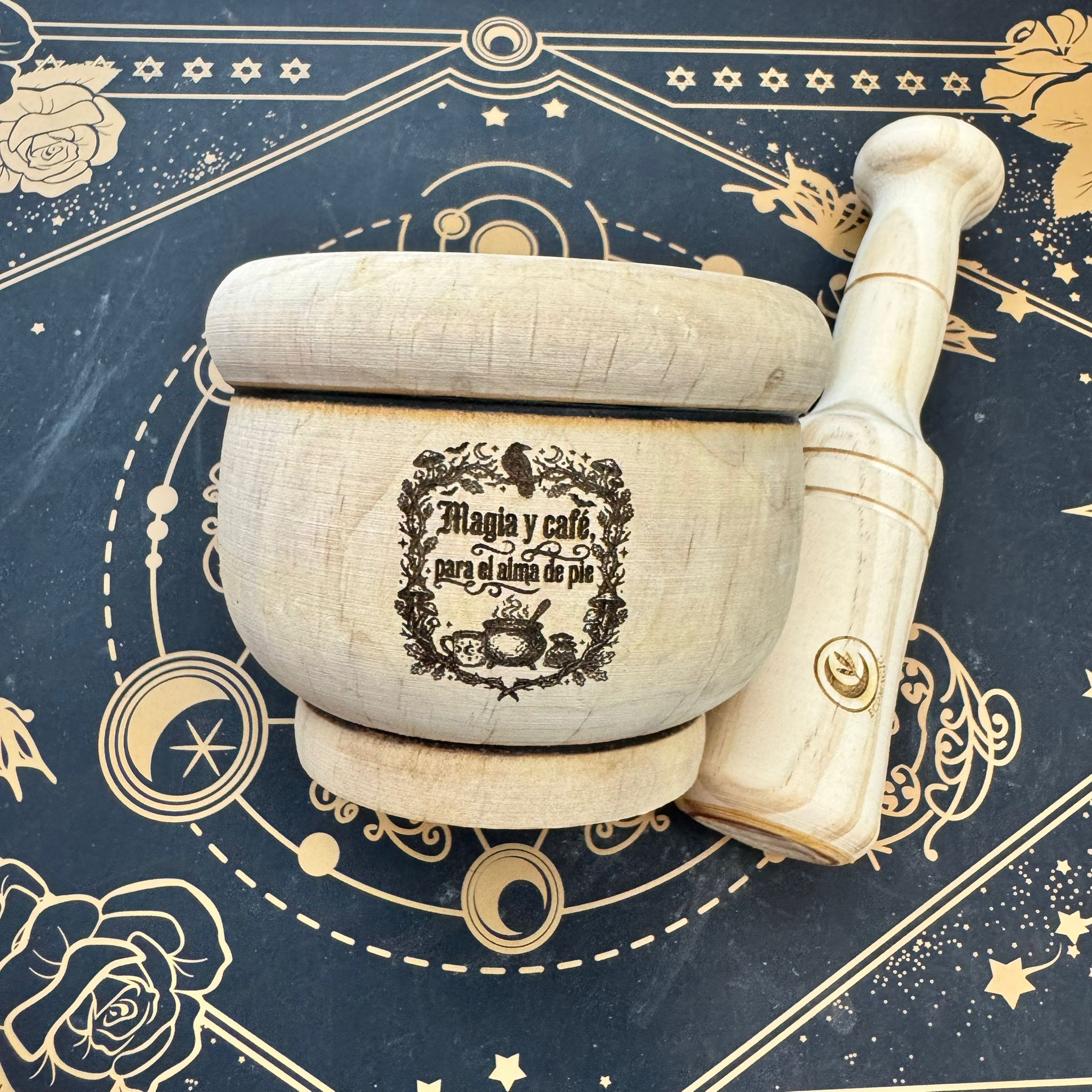 El Mortero de Madera “Magia y café para el alma de pie” es una pieza que une dos rituales sagrados del día a día: la magia consciente y el café como acto de autocuidado y presencia. Tallado en madera natural y grabado con esta frase evocadora, este mortero celebra esos pequeños momentos cotidianos que sostienen el espíritu incluso en los días más intensos.