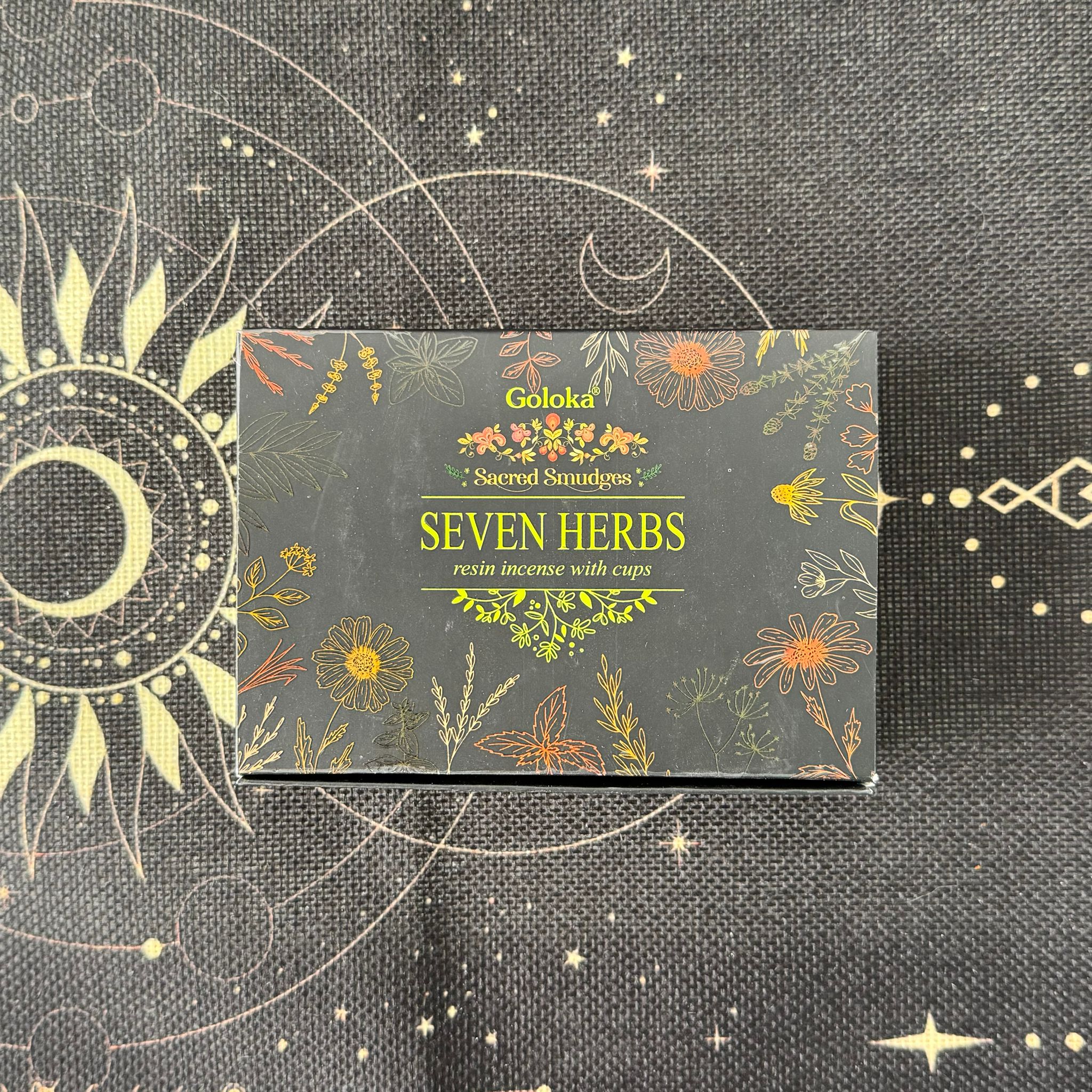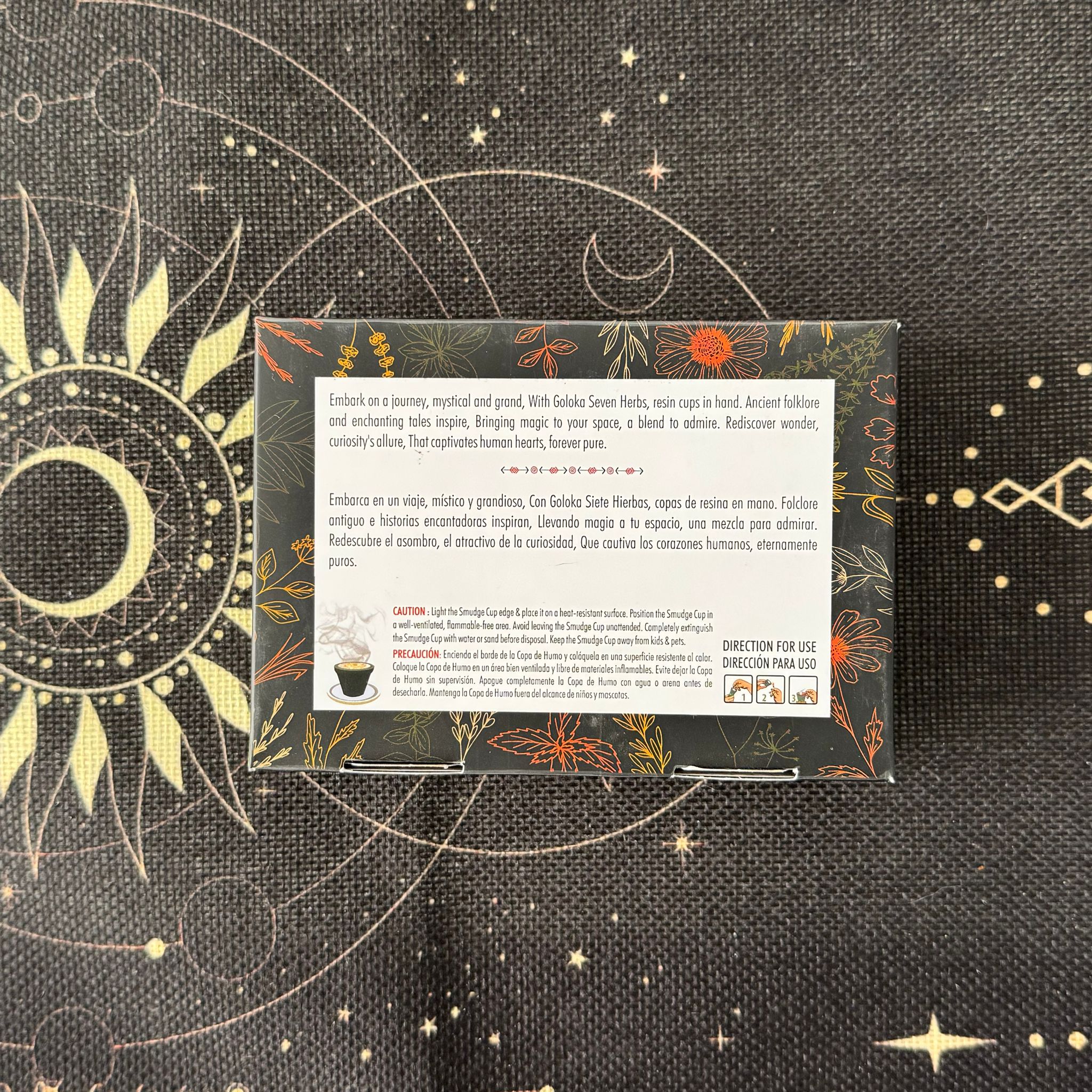 Incienso en formato copa de la marca Goloka, elaborado con resinas naturales, carbón vegetal y una mezcla sagrada de siete hierbas tradicionales utilizadas en rituales de protección, limpieza y buena suerte.