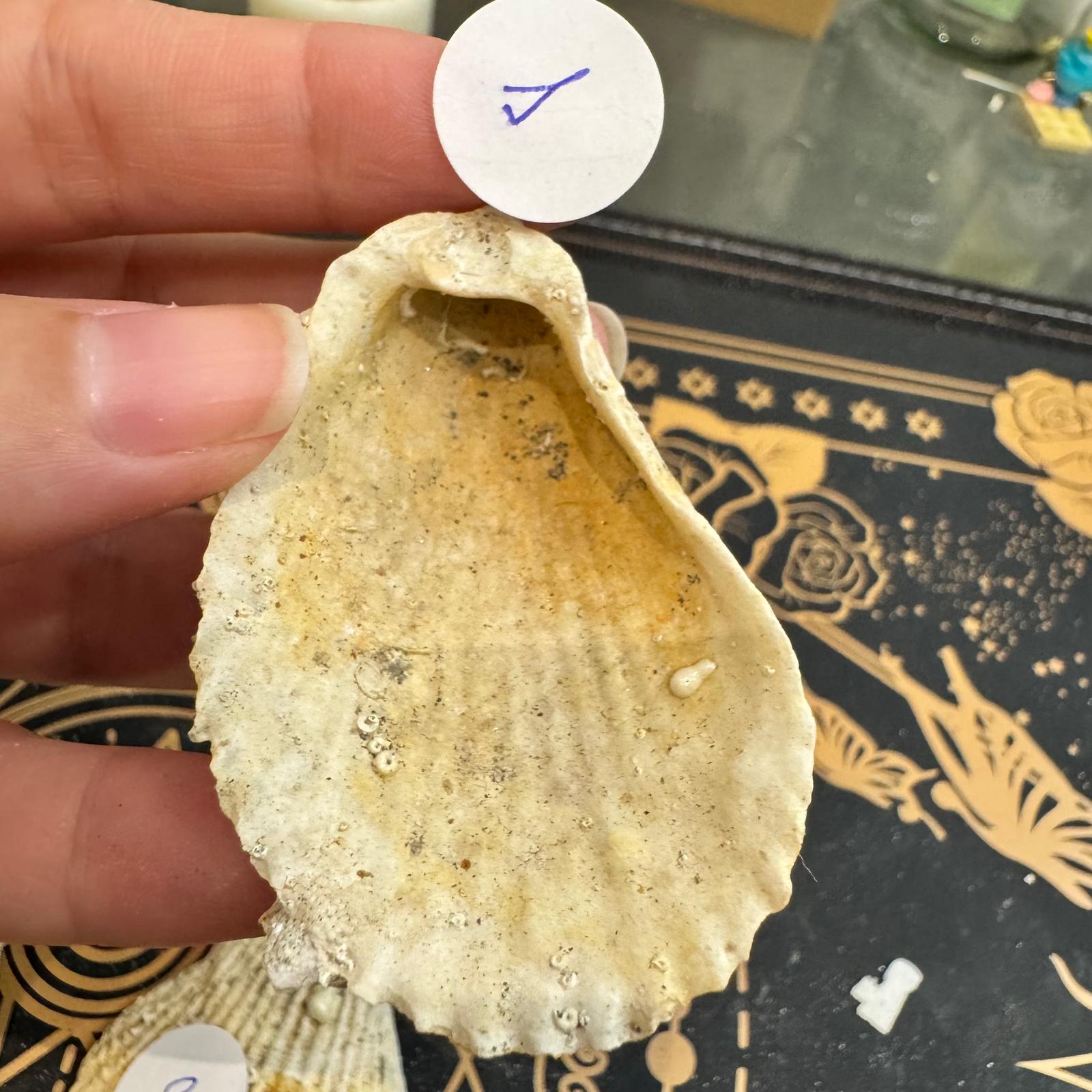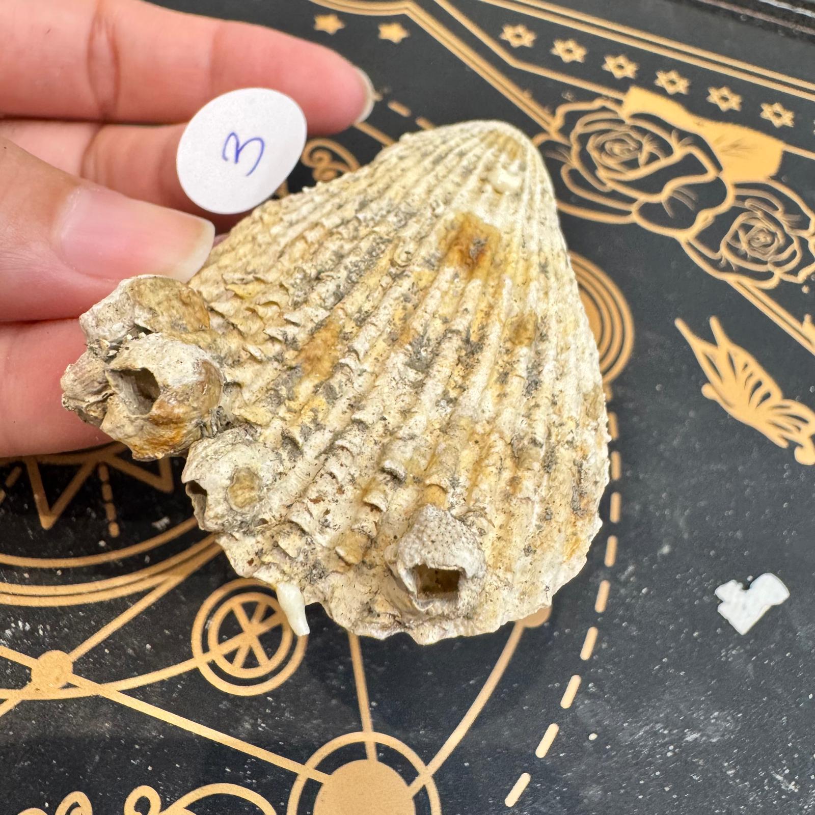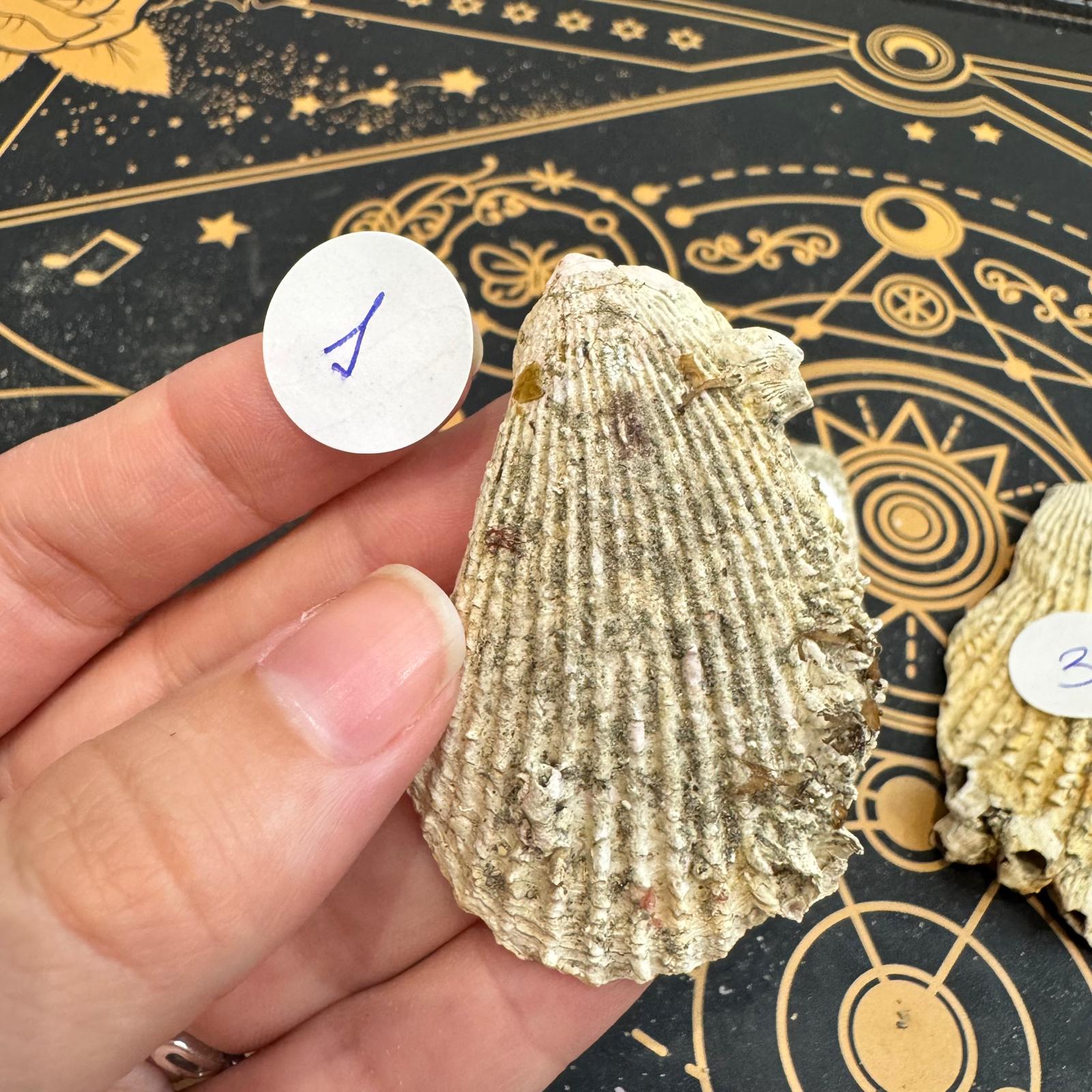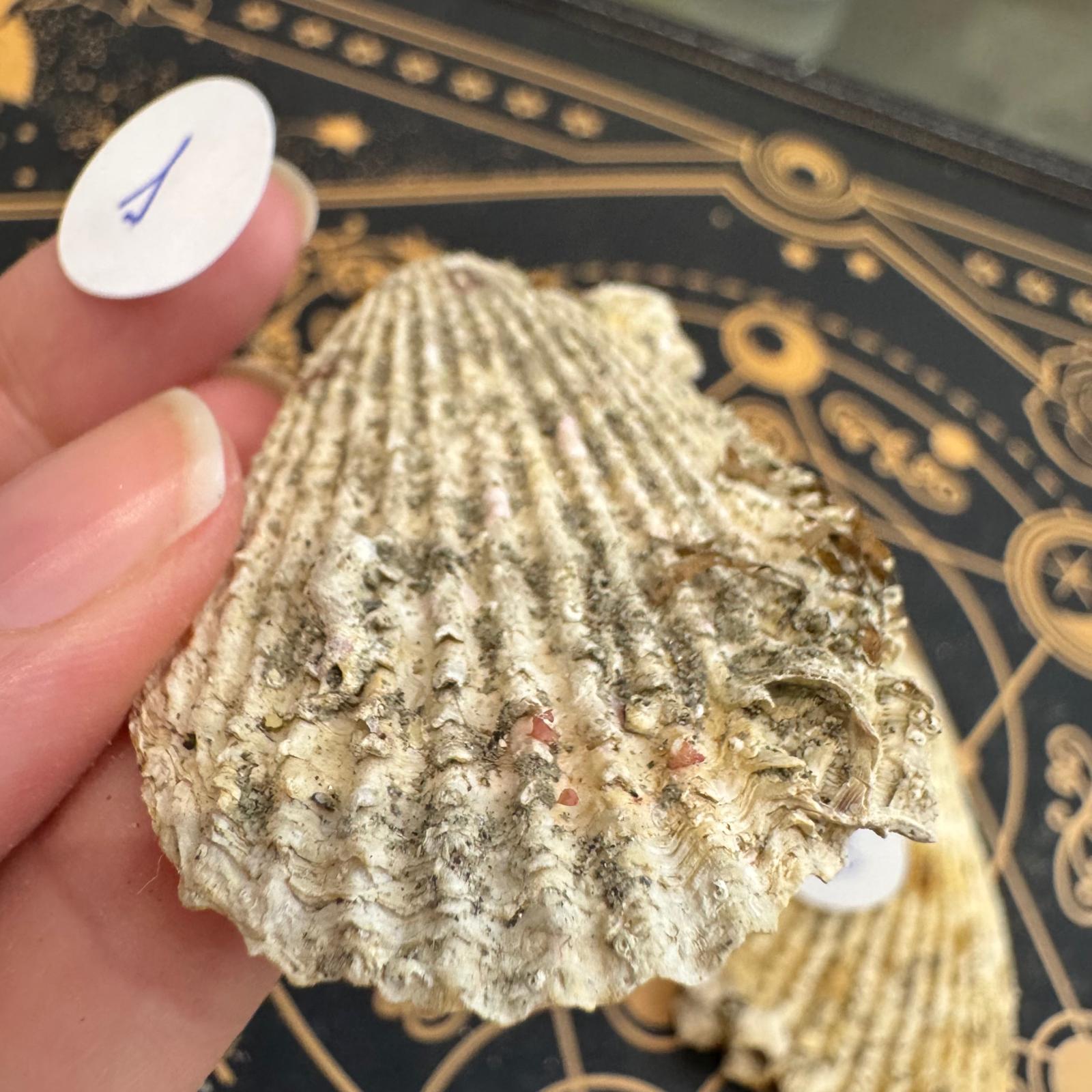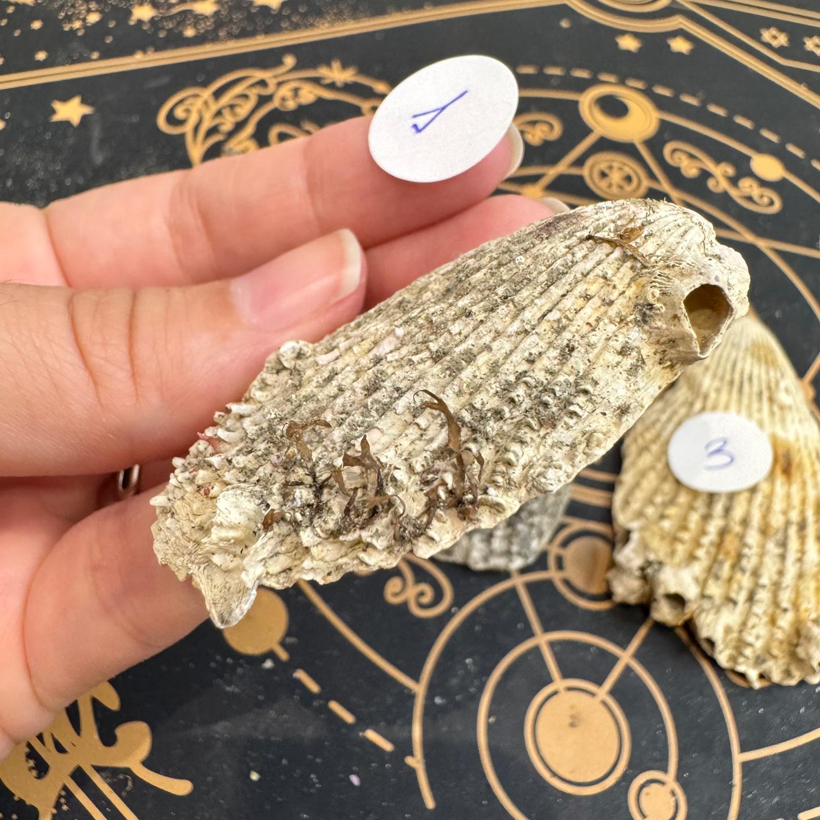 Estas piezas marinas son auténticos tesoros del océano: conchas naturales que conservan bellotas de mar (balanos) adheridas de forma orgánica durante años bajo el agua. Cada una es completamente única, mostrando las huellas del tiempo, la sal y la vida marina.