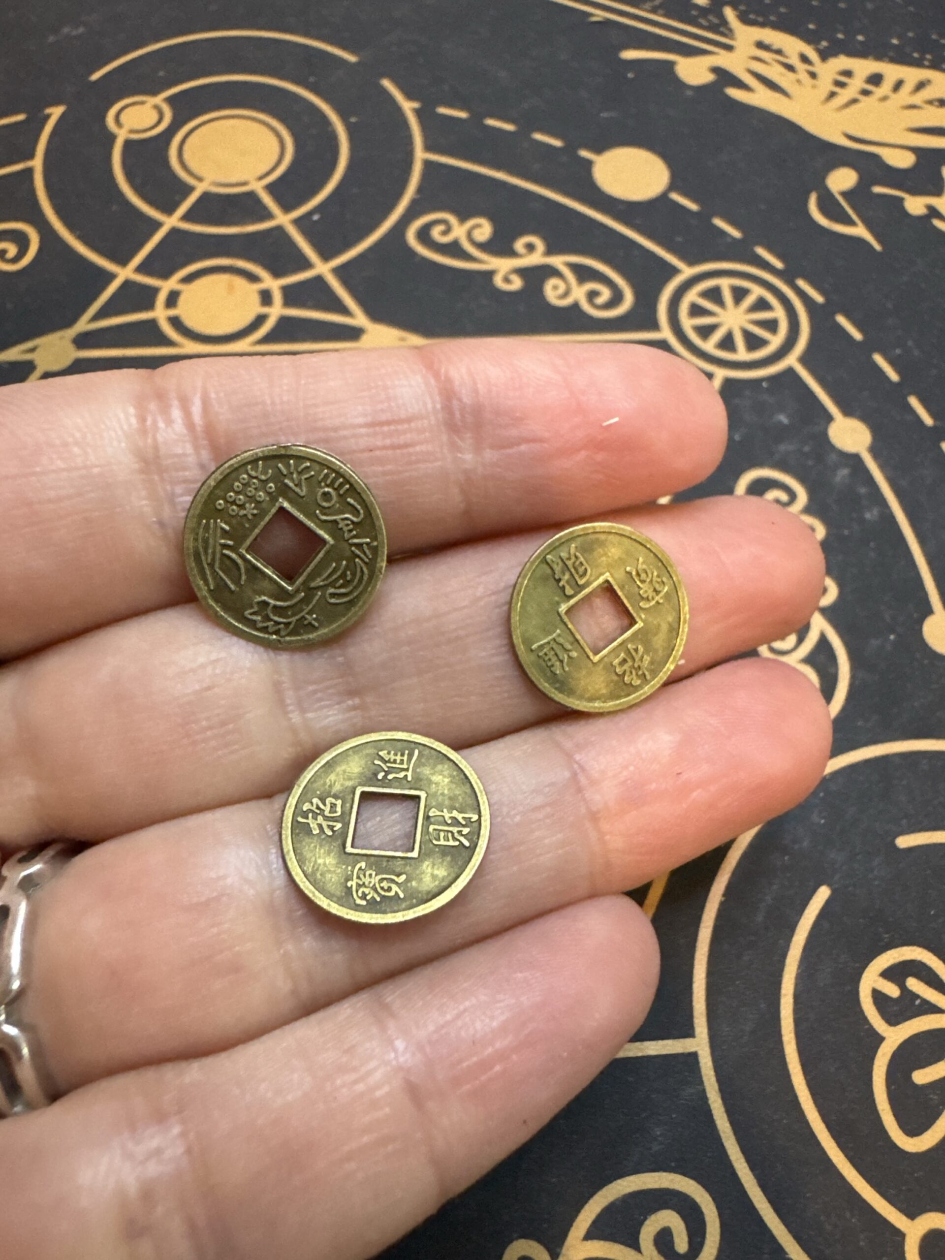 Pack de 3 monedas chinas tradicionales para atraer prosperidad, abundancia y protección económica, ideales para rituales, altar o llevar como amuleto.