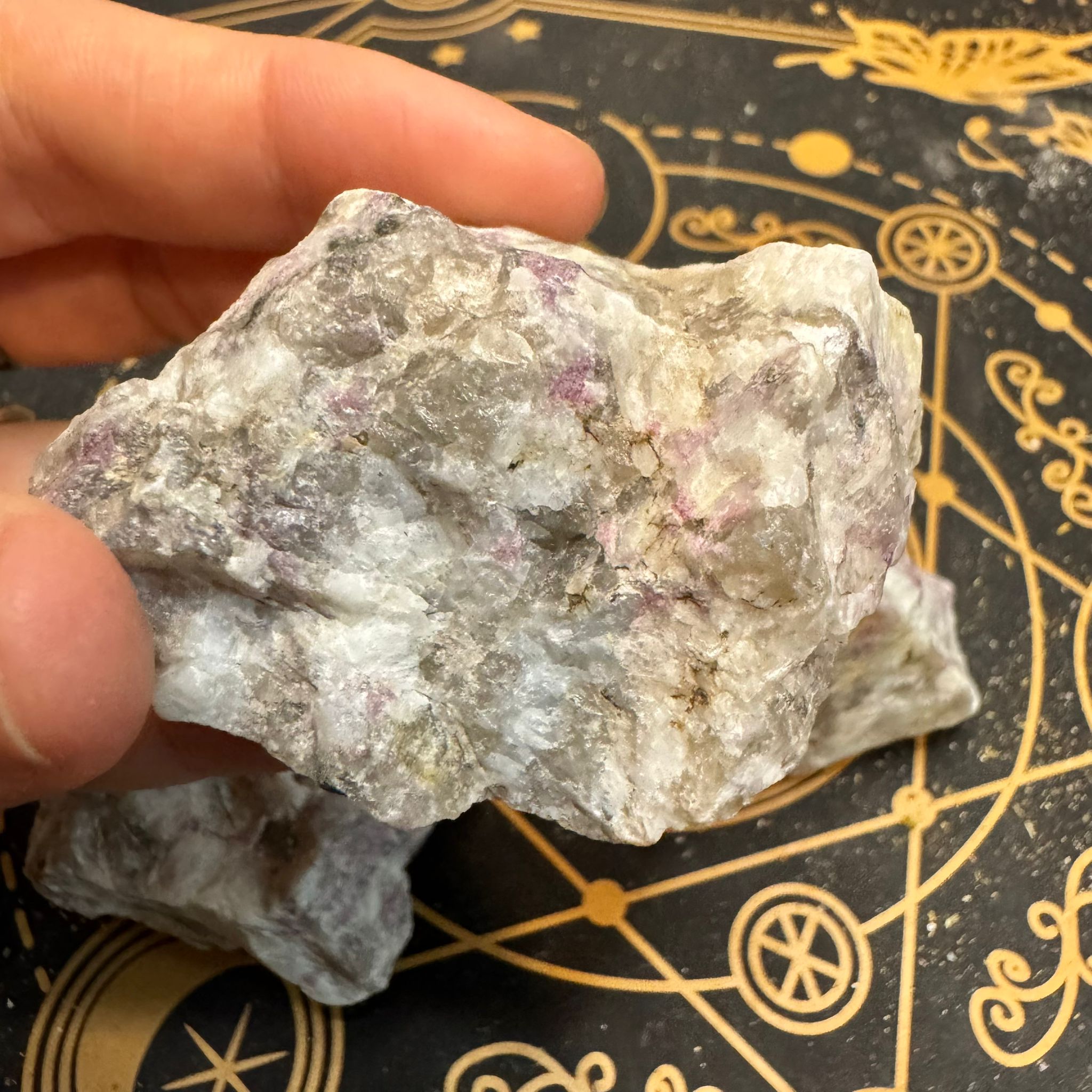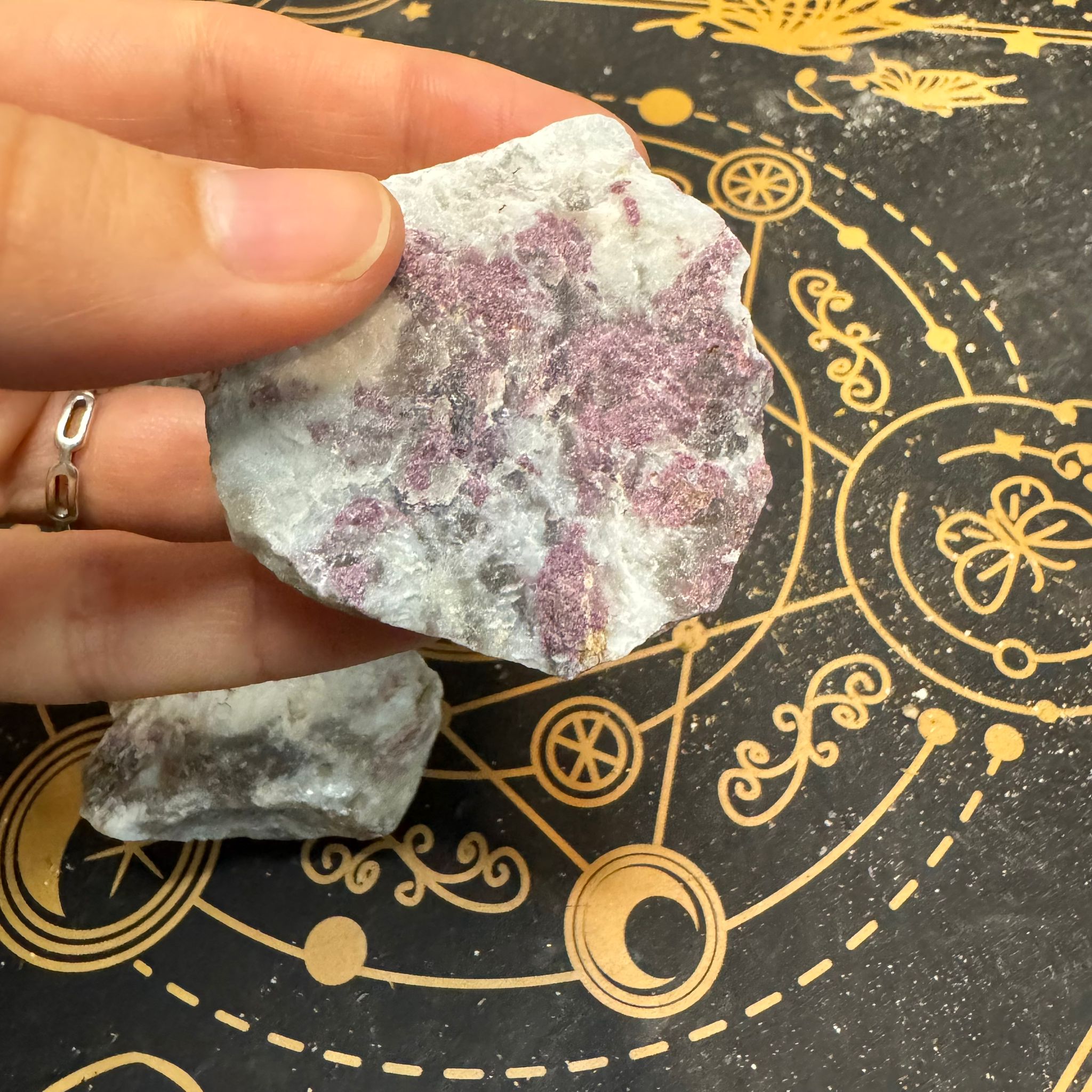 En el ámbito espiritual, la lepidolita se asocia con la tranquilidad mental, ayudando a suavizar pensamientos repetitivos, ansiedad y estados de sobrecarga emocional. Es considerada una piedra de transición, especialmente útil en momentos de cambio, duelo o procesos personales intensos.