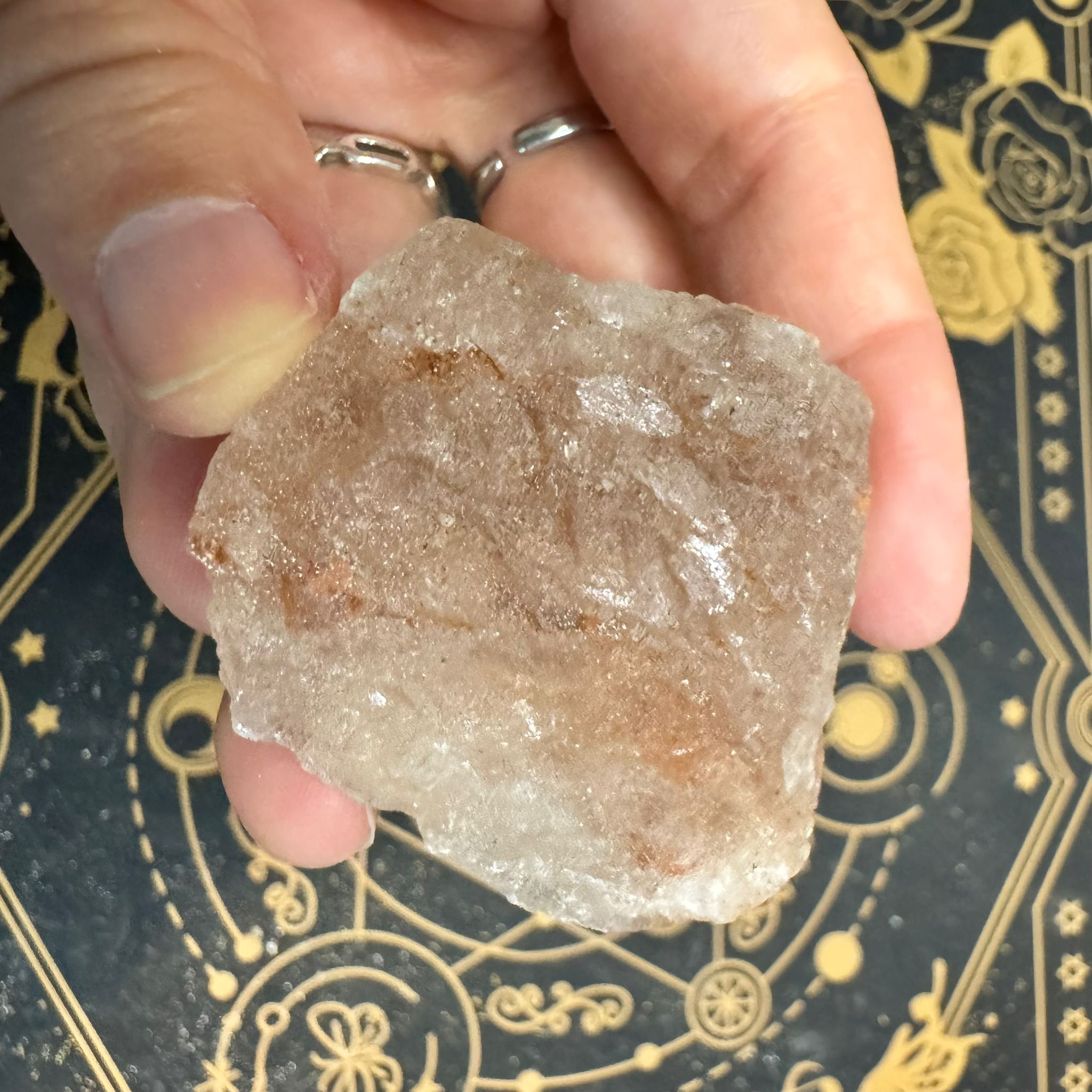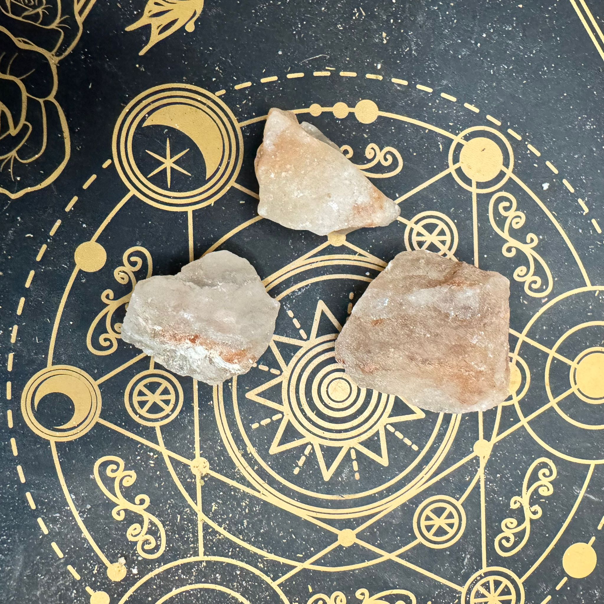 A diferencia de la halita cristalina más definida, la piedra de sal suele presentarse en bloques más opacos o irregulares, lo que la hace especialmente práctica para usos domésticos y rituales sencillos.