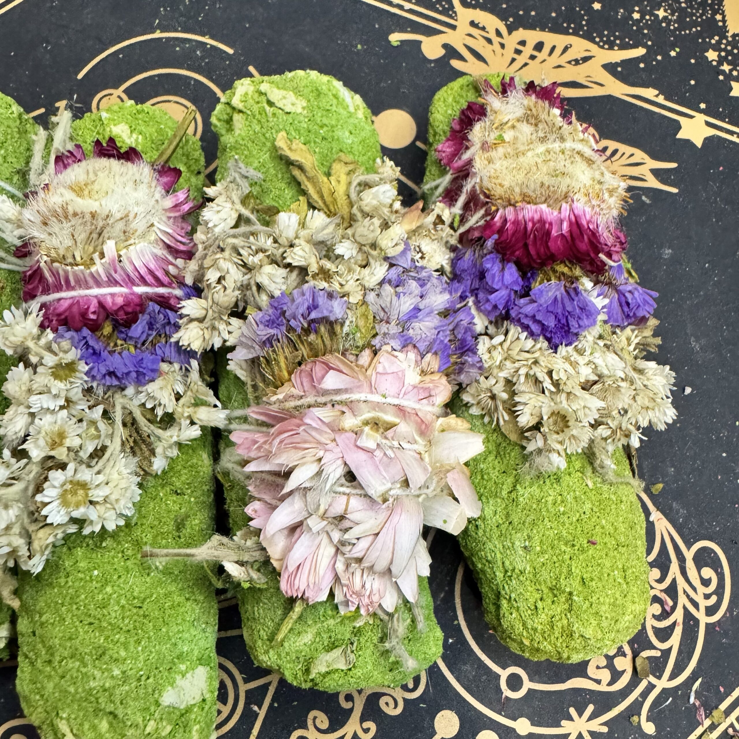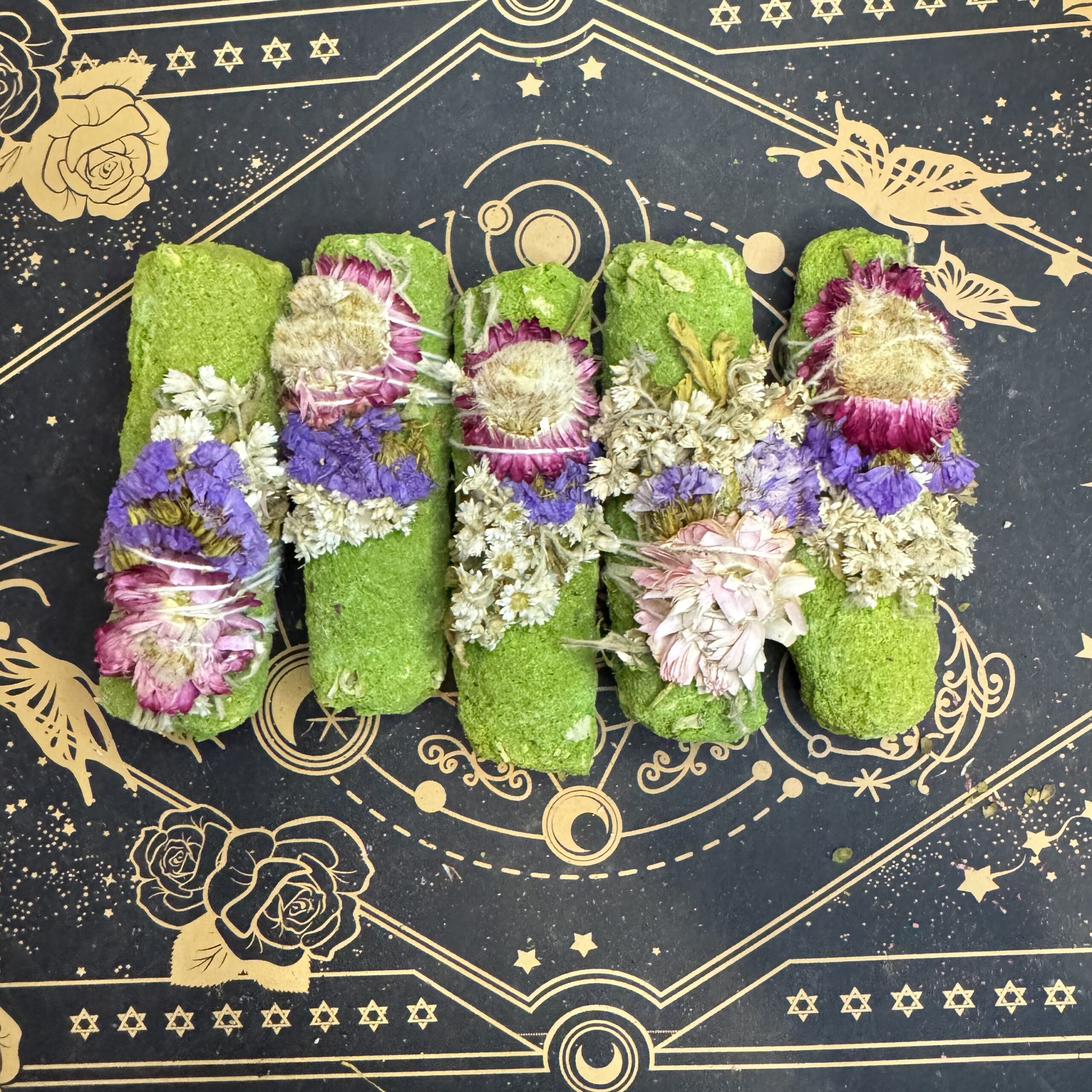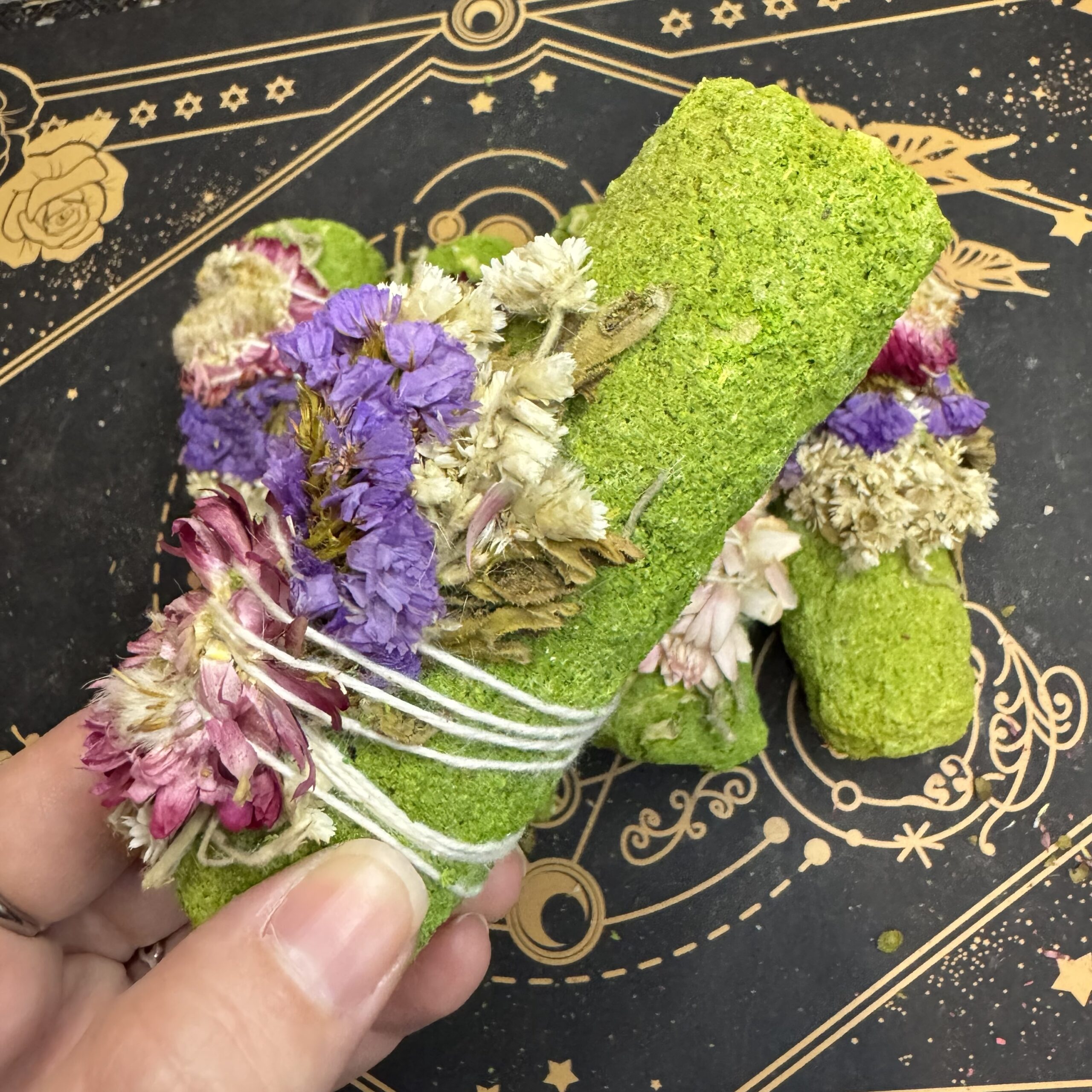 El color verde está asociado al equilibrio, la sanación, el crecimiento y la calma, mientras que las flores aportan una vibración de armonía, belleza y suavidad energética. Cada sahumerio es único y artesanal, pensado para rituales conscientes, meditación, aperturas de ciclo o simplemente para refrescar el ambiente.